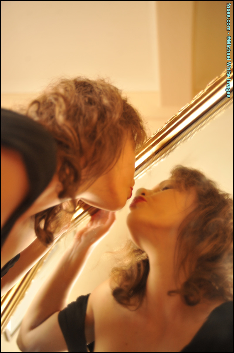 Британская красавица Тина Кей наносит красную помаду перед тем, как раздеться перед зеркалом