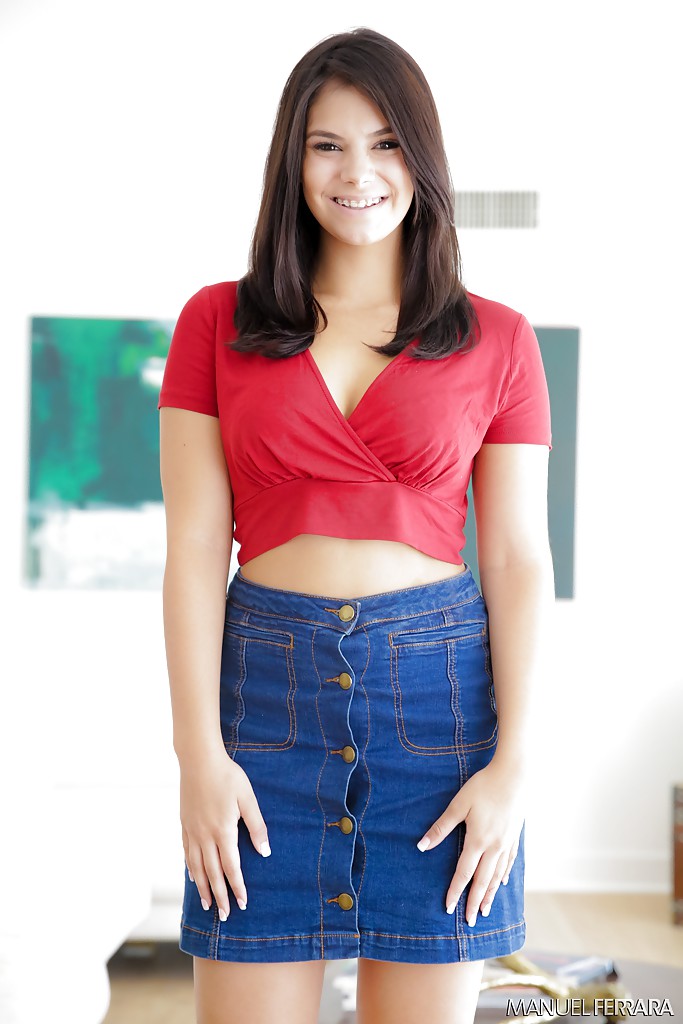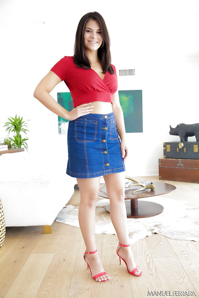 Брюнетка-порнозвезда в мини-юбке приглашает оценить ее потрясающие дырочки
