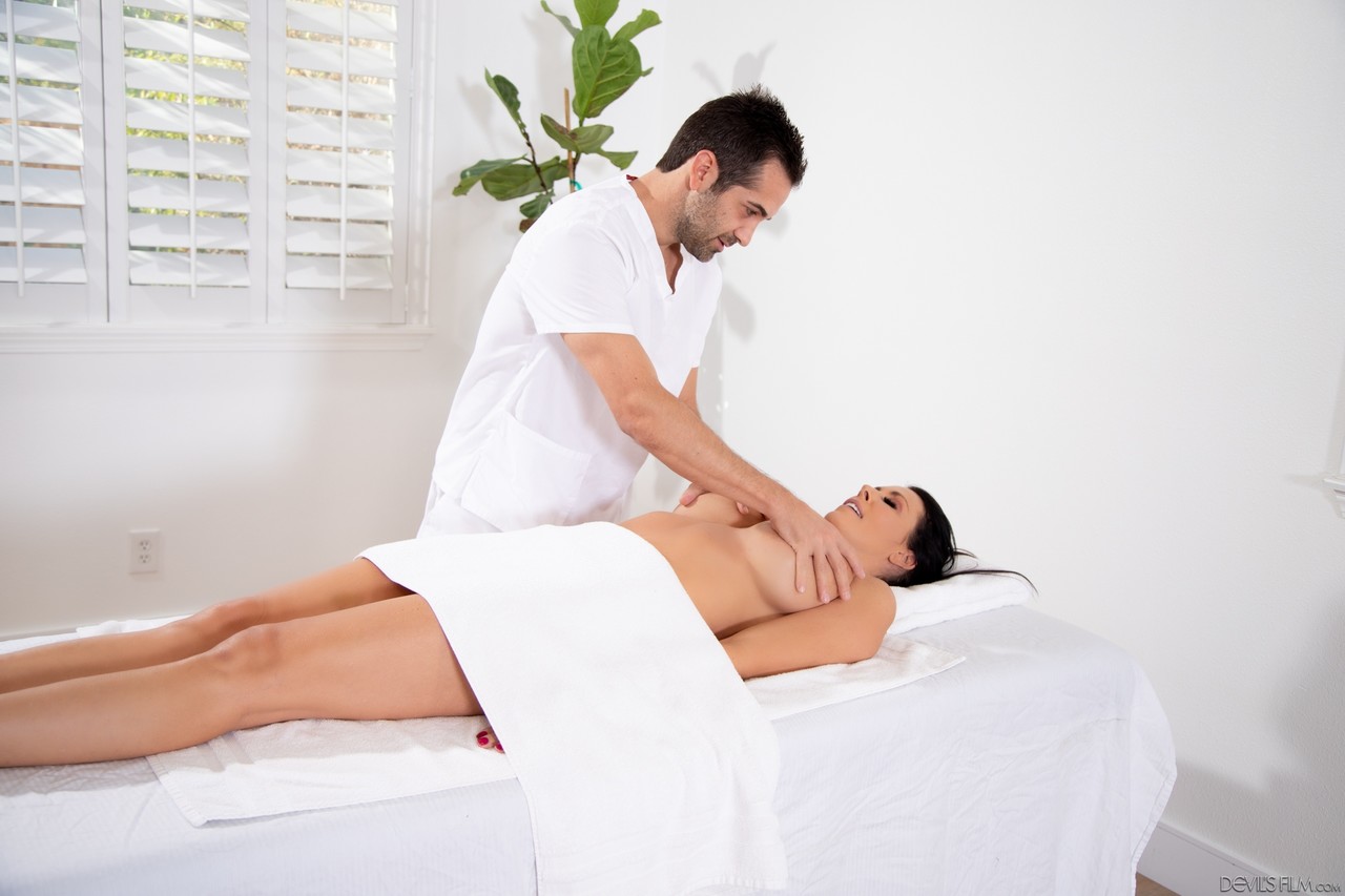Брюнетка Рейган Фокс получает сперму на свои большие сиськи после секса с массажистом