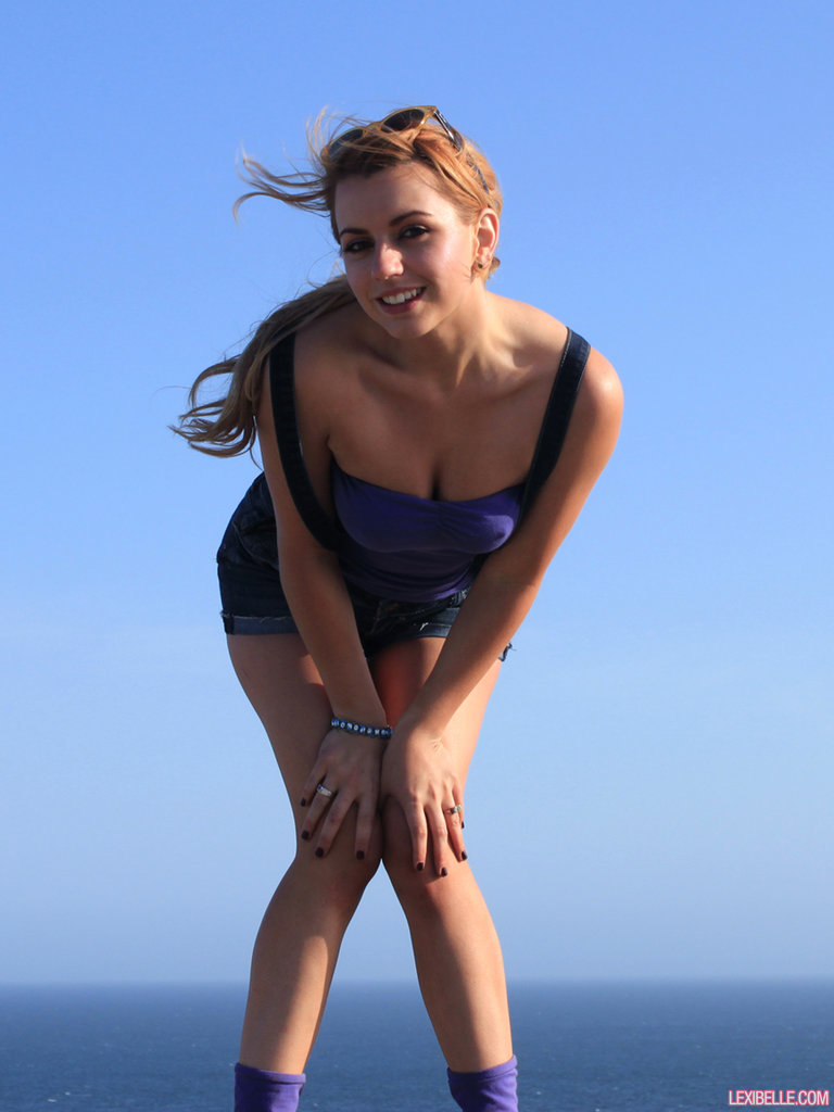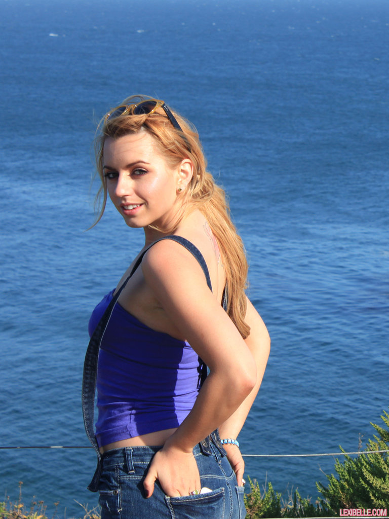 Девушка-одиночка Лекси Белль обнажает свои сиськи и задницу во время прогулки у океана