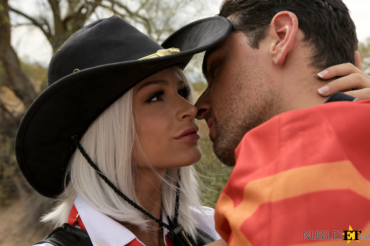 Худенькая девушка Эмма Хикс слизывает сперму с пальца после косплей-секса на зарослях кустарника