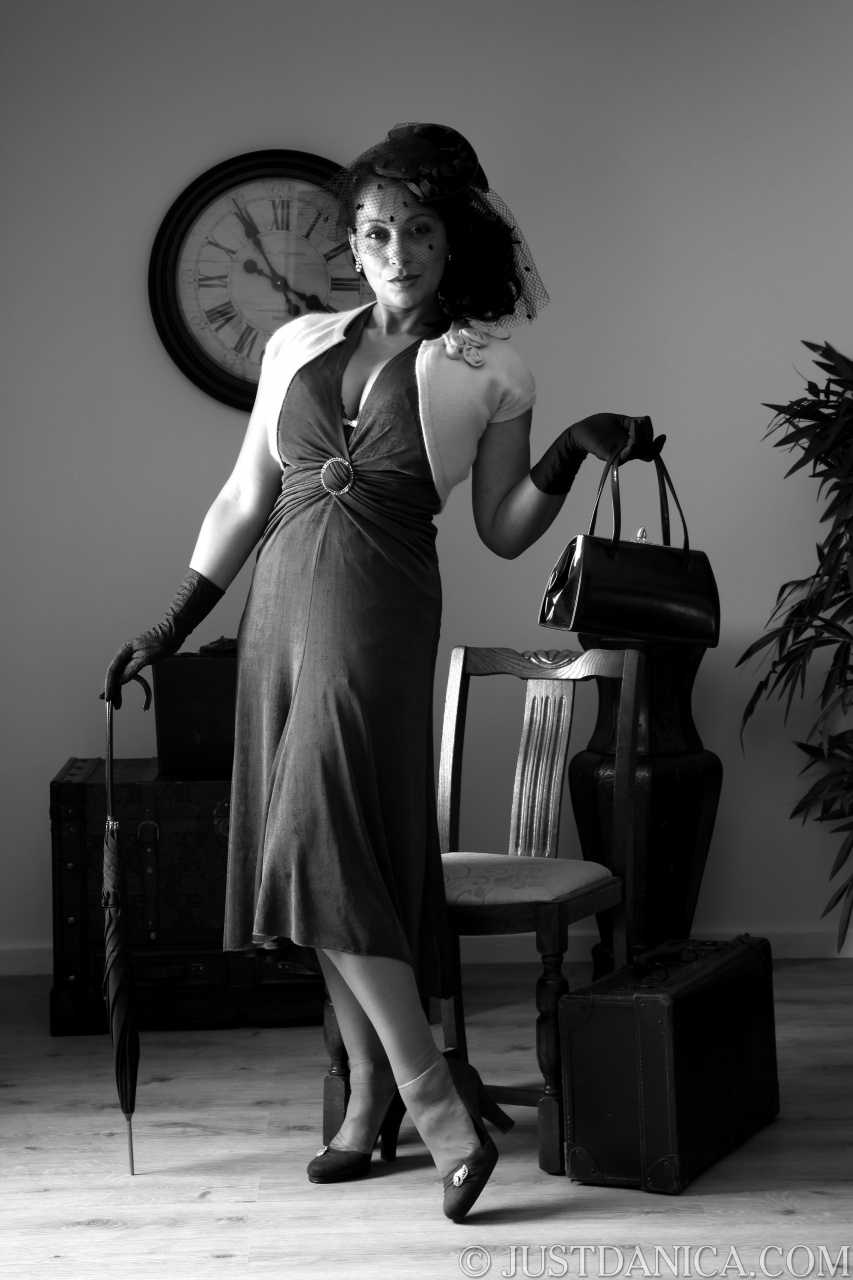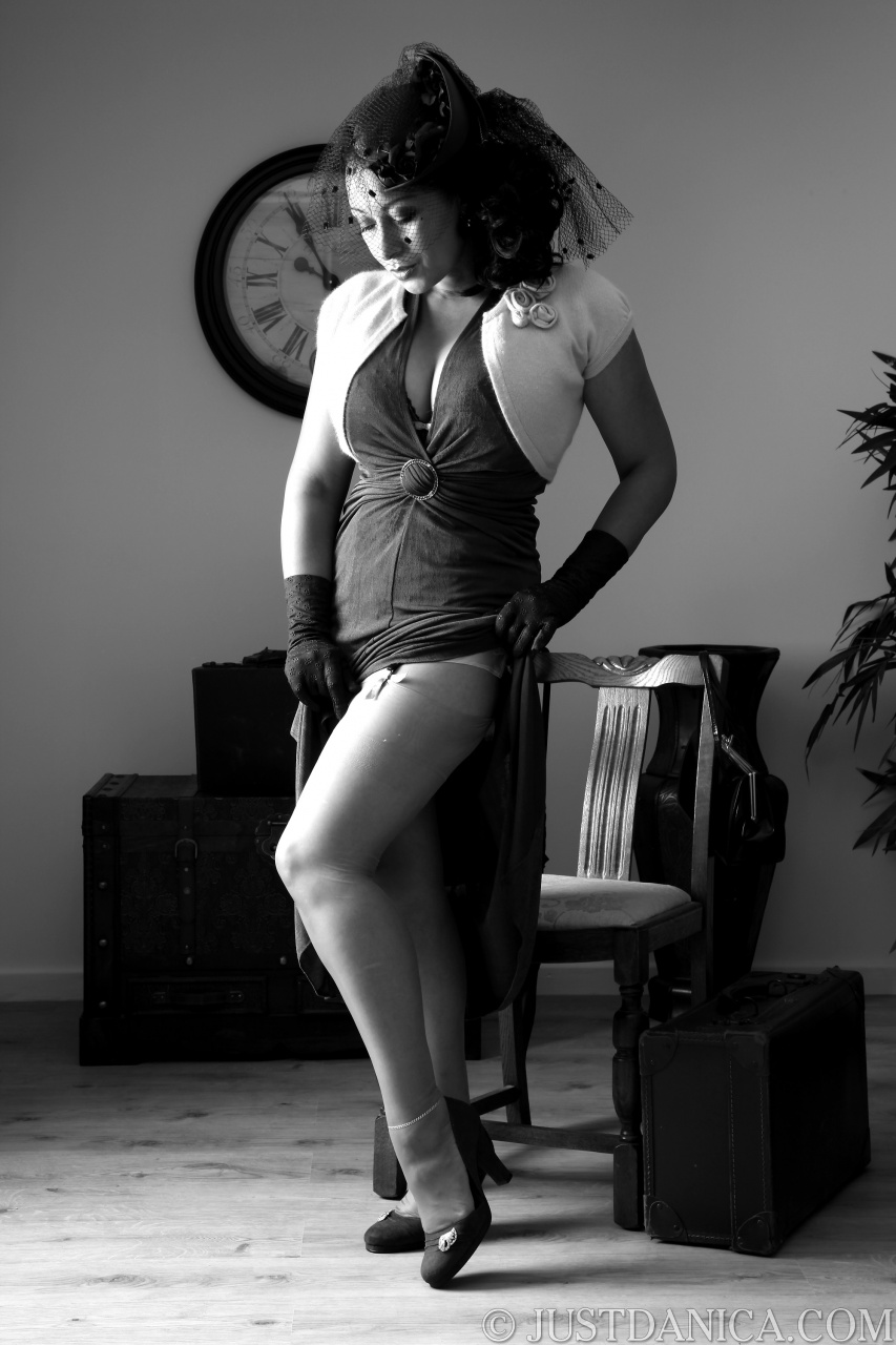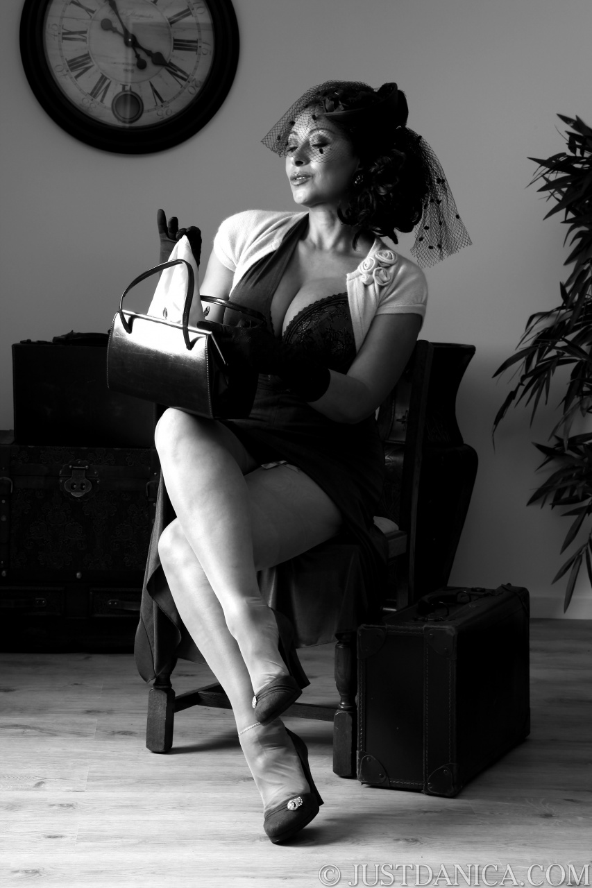 Классная зрелая дама Даника Коллинз с обнаженными большими сиськами и кустом в черных перчатках