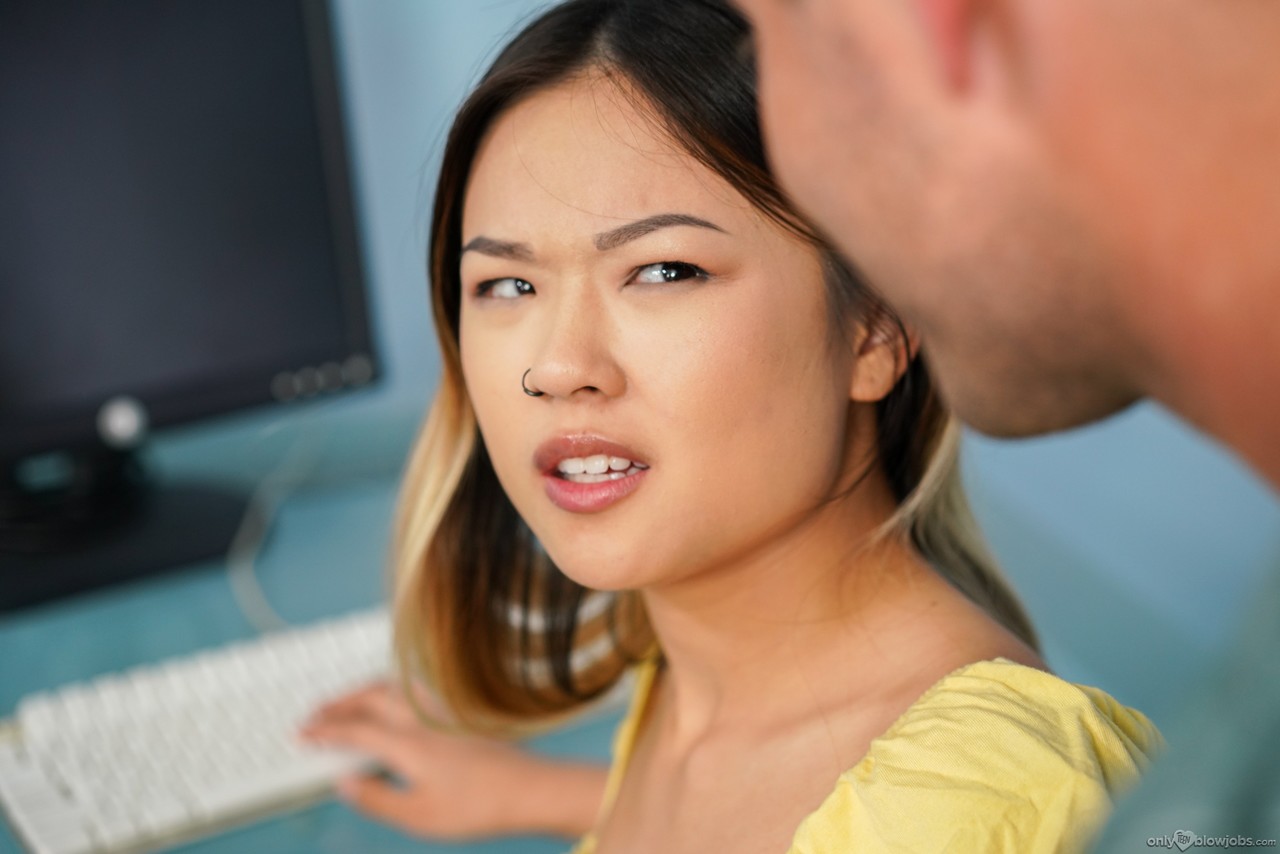 Миниатюрная азиатка лижет мошонку, отсасывая маленький член