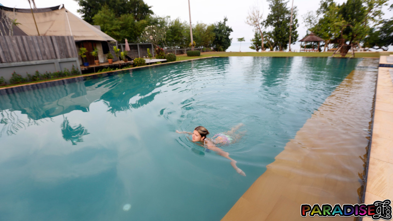 Миниатюрная молоденькая Джина Герсон обнажает свои маленькие сиськи в бикини у бассейна