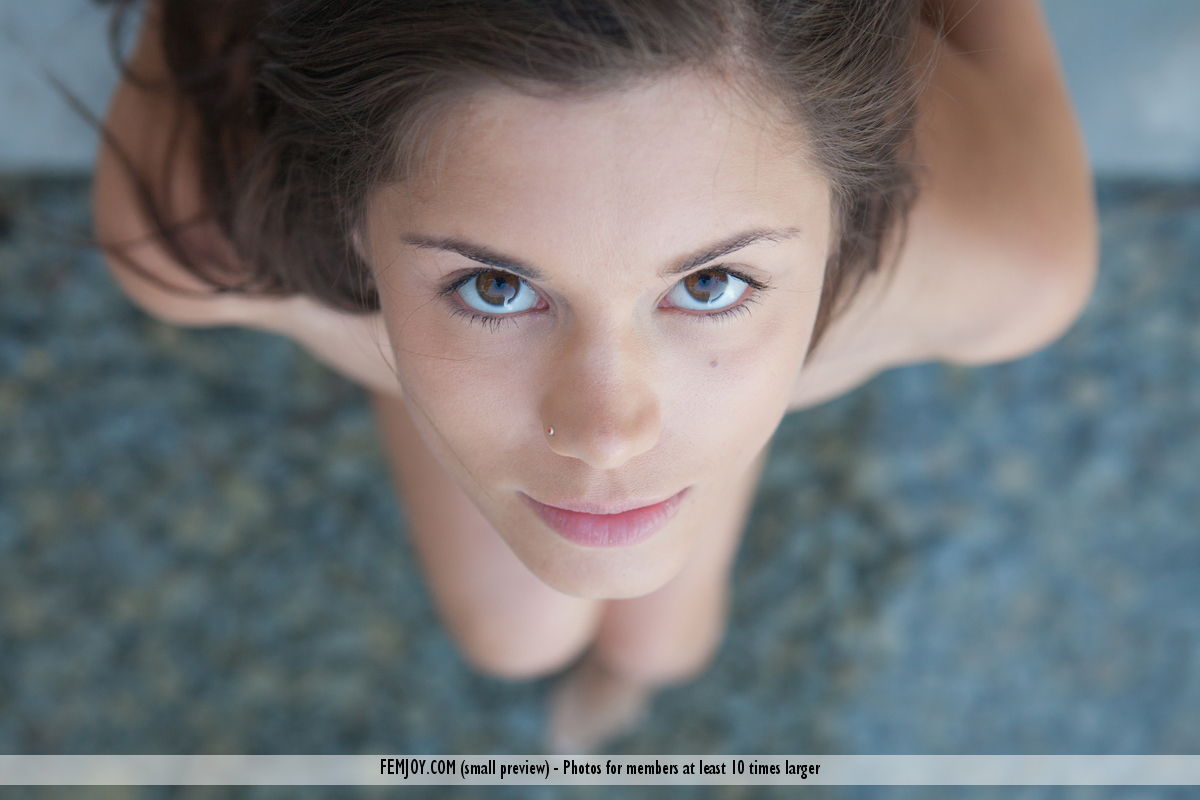 Молодая девушка-одиночка Каприс купается в бассейне во внутреннем дворе совершенно голая