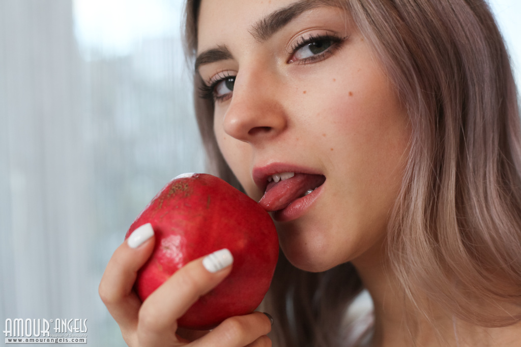Молоденькая платиновая блондинка Бриджит обхватывает ладонями свои красивые сиськи, раздеваясь в носках