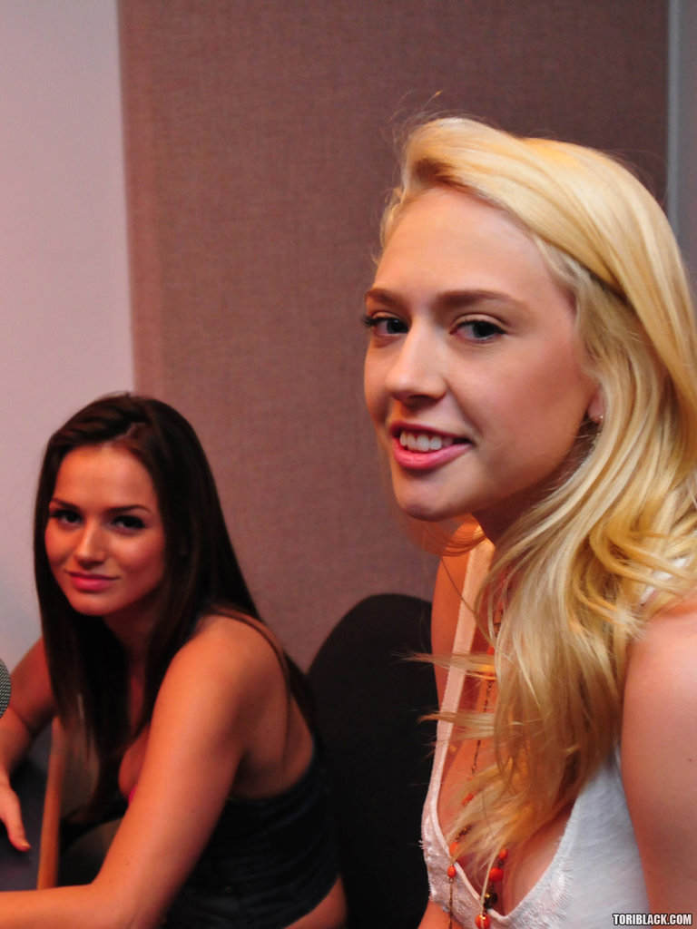 Пара блондинок обнажают свои красивые сиськи во время подкаста