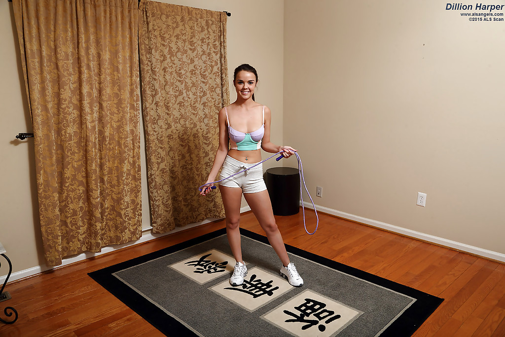 Подтянутая любительница Диллион Харпер показывает красивые сиськи перед мастурбацией лысой пизды