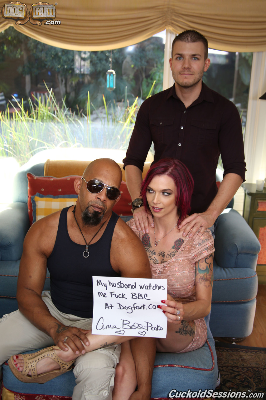 Распутная Анна Белл Пикс стоит на коленях и сосет большой черный член в страстном сексе втроем