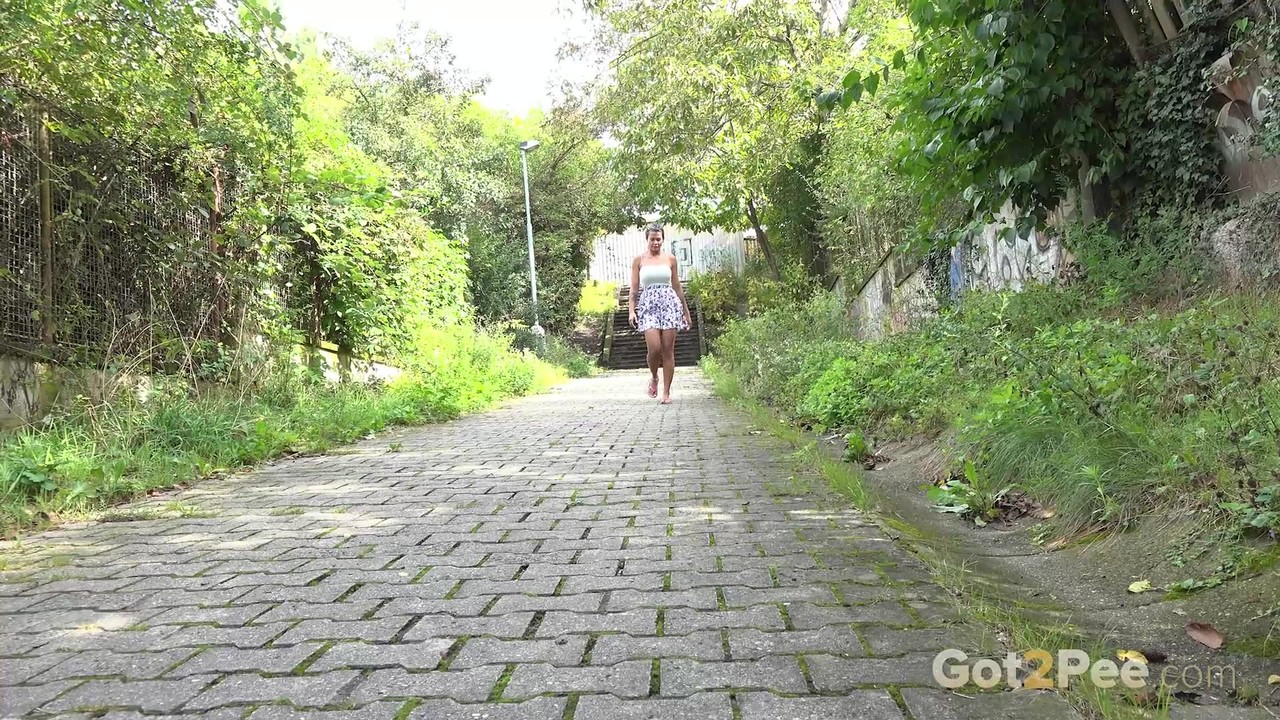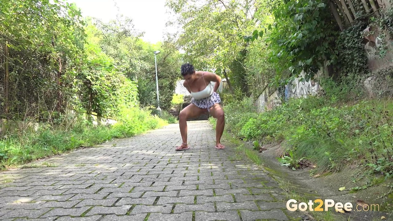 Расстроенная девушка Хлоя Ламур мочится на вымощенную булыжником дорожку