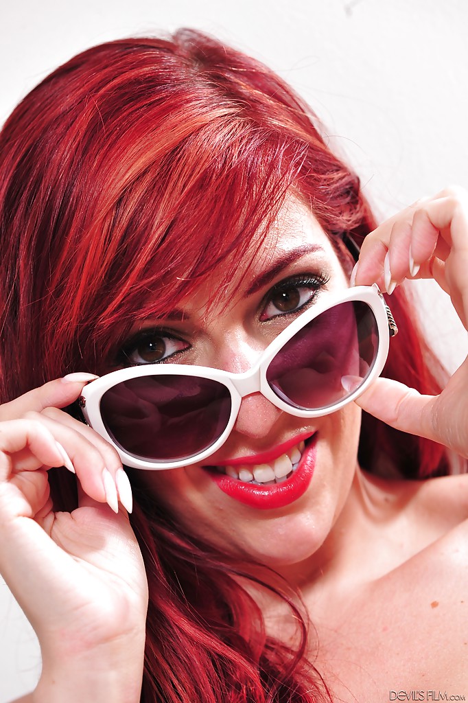 Рыжеволосая соло-девушка Лорен Филлипс обнажает красивые дыни и волосатую киску