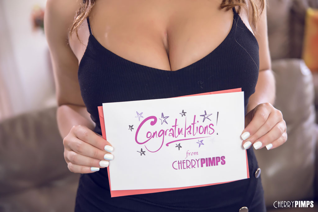Симпатичная девушка Наташа Найс празднует то, что ее выбрали вишенкой месяца