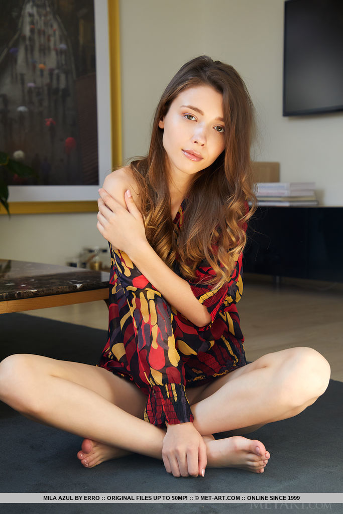 Симпатичная молоденькая Мила Азул щеголяет в юбке без трусиков, прежде чем позировать полностью обнаженной
