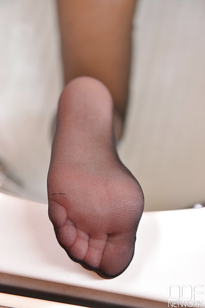 Симпатичная соло-красотка Меган Рейн лижет свои собственные пальчики, обтянутые нейлоном
