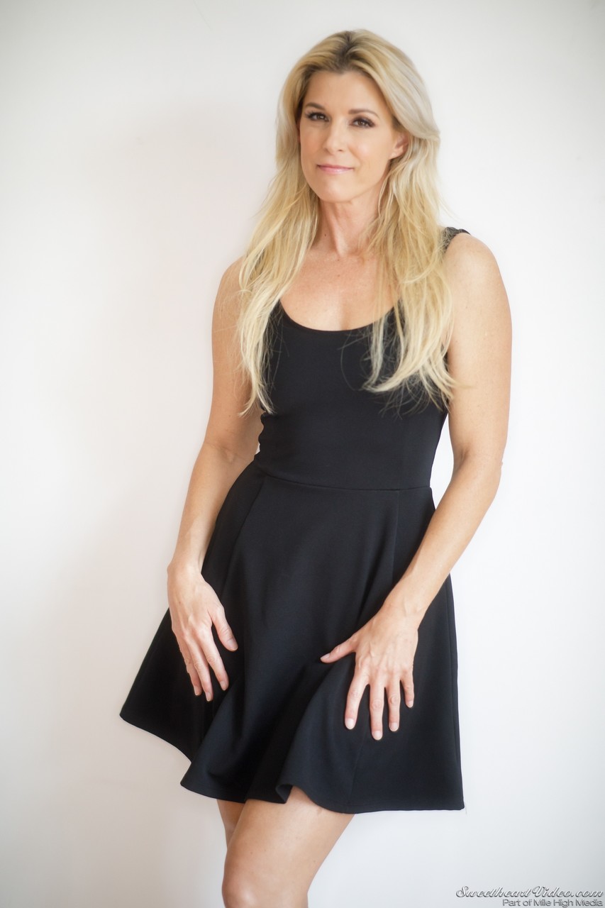 Сольная модель Индия Саммер снимает черное платье и трусики, чтобы позировать обнаженной
