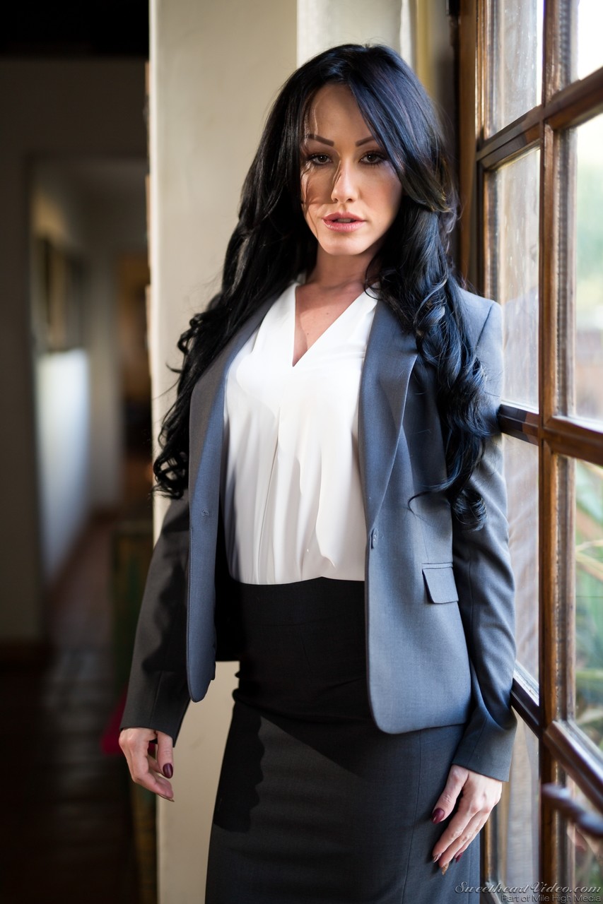 Темноволосая женщина снимает блейзер и юбку, чтобы позировать обнаженной перед окном