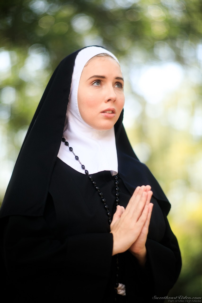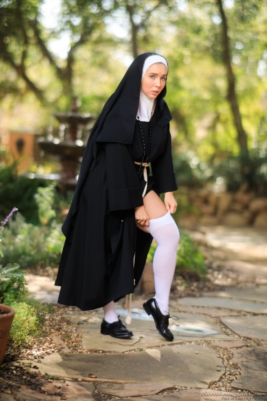 Толстая монахиня обнажает себя во дворе в носках выше колен