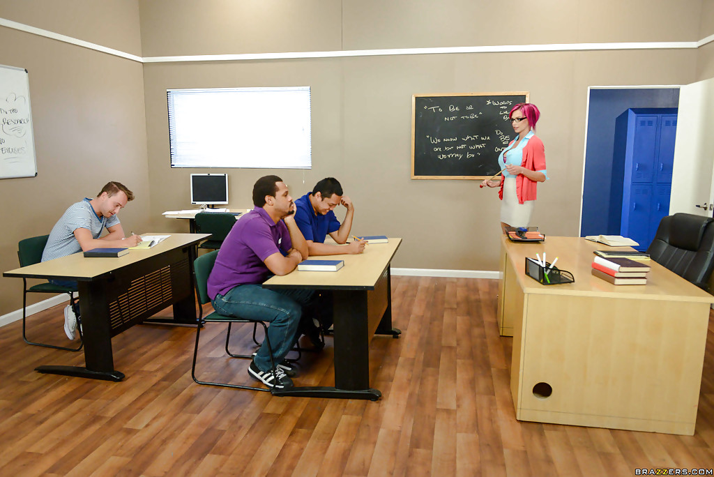 Великолепная учительница милф Анна Белл Пикс трясет огромным членом ученика в классе