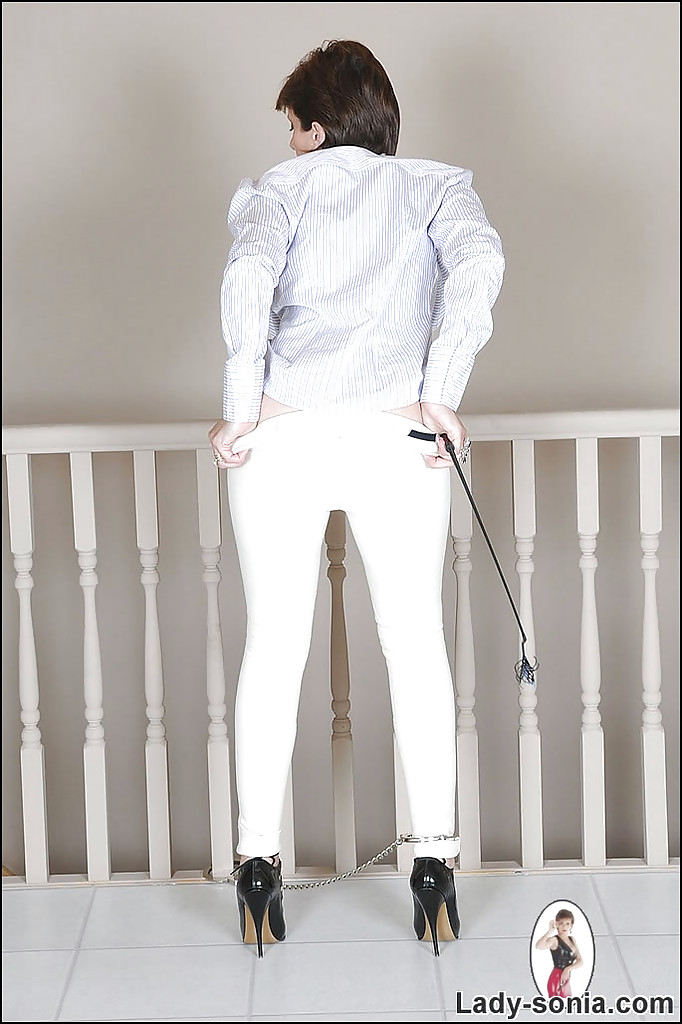Зрелая фетишистка на высоких каблуках обнажает свою сексуальную попку и лысую киску