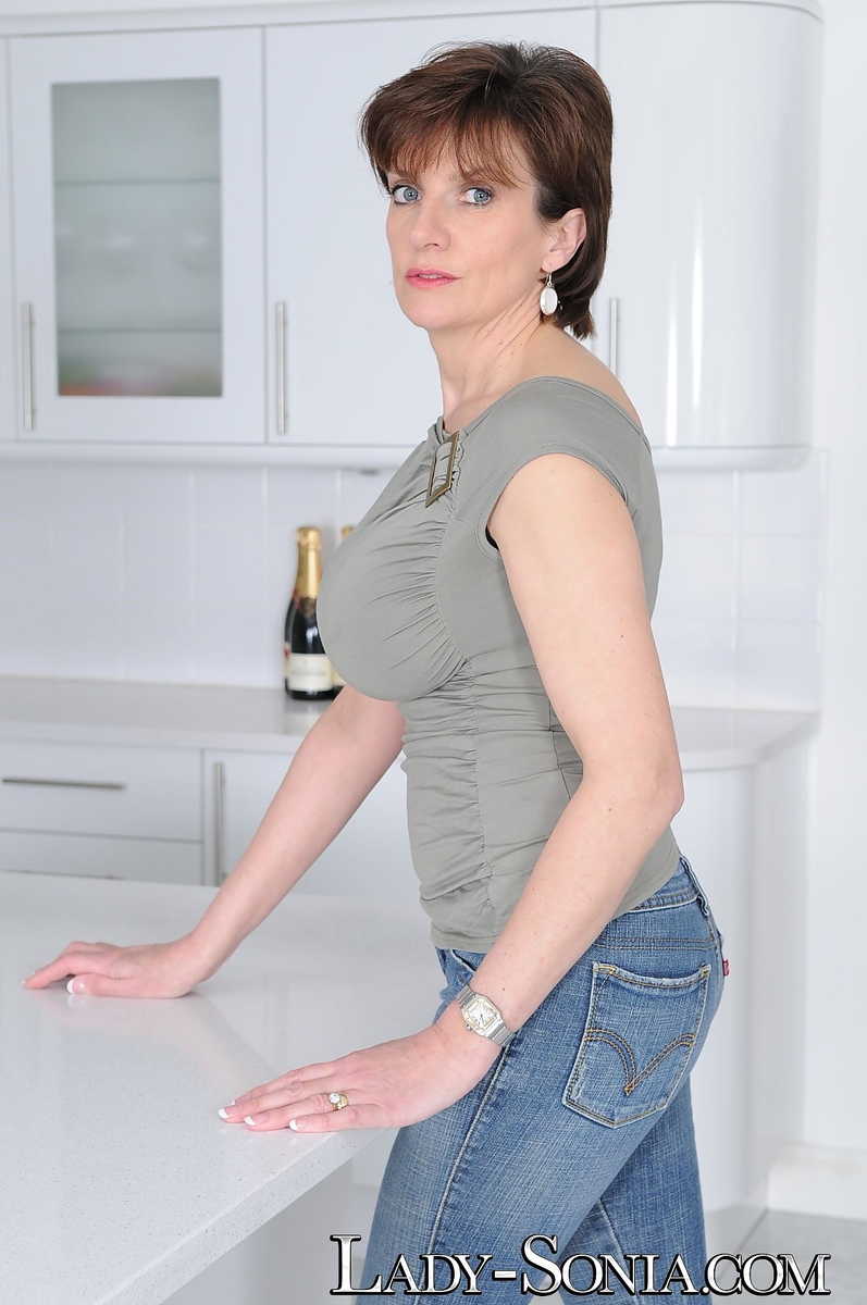 Зрелая жена леди Соня щеголяет большими сиськами без лифчика в футболке на кухне