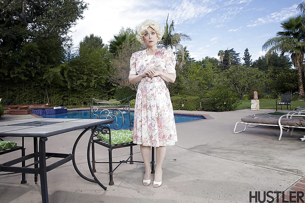 Зрелая порнозвезда Нина Хартли позирует на открытом воздухе в подвязках и нейлоновых чулках